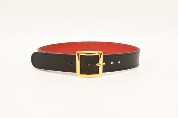 From our PFenning Luxury Belt Collection, this Gia 24K Gold plated buckle set is paired with a 1½” wide smooth black leather belt and lined with a lipstick red leather lining. This design is then finished with black stitching and a black edge.