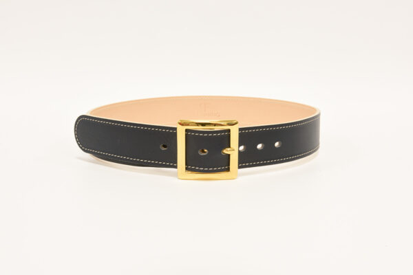 From our PFenning Luxury Belt Collection, this Gia 24K Gold plated buckle set is paired with a 1½” wide smooth dark navy leather belt and lined with a natural leather lining. This design is then finished with ivory stitching and a ivory edge.