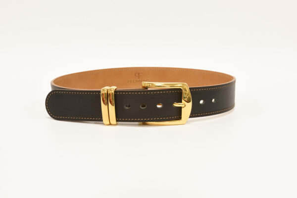From our PFenning Luxury Belt Collection, this Martina 24K Gold plated buckle set is paired with a 1½” wide smooth black leather belt and lined with a tan leather lining. This design is then finished with brown stitching and a black edge.