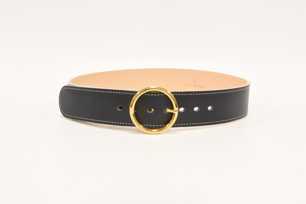From our PFenning Luxury Belt Collection, this Renata 24K Gold plated buckle set is paired with a 1½” wide smooth dark navy leather belt and lined with a natural leather lining. This design is then finished with ivory stitching and a ivory edge.