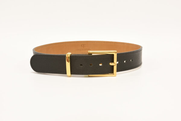 From our PFenning Luxury Belt Collection, this Sophia 24K Gold plated buckle set is paired with a 1½” wide textured black leather belt and lined with a tan leather lining. This design is then finished with black stitching and a black edge.